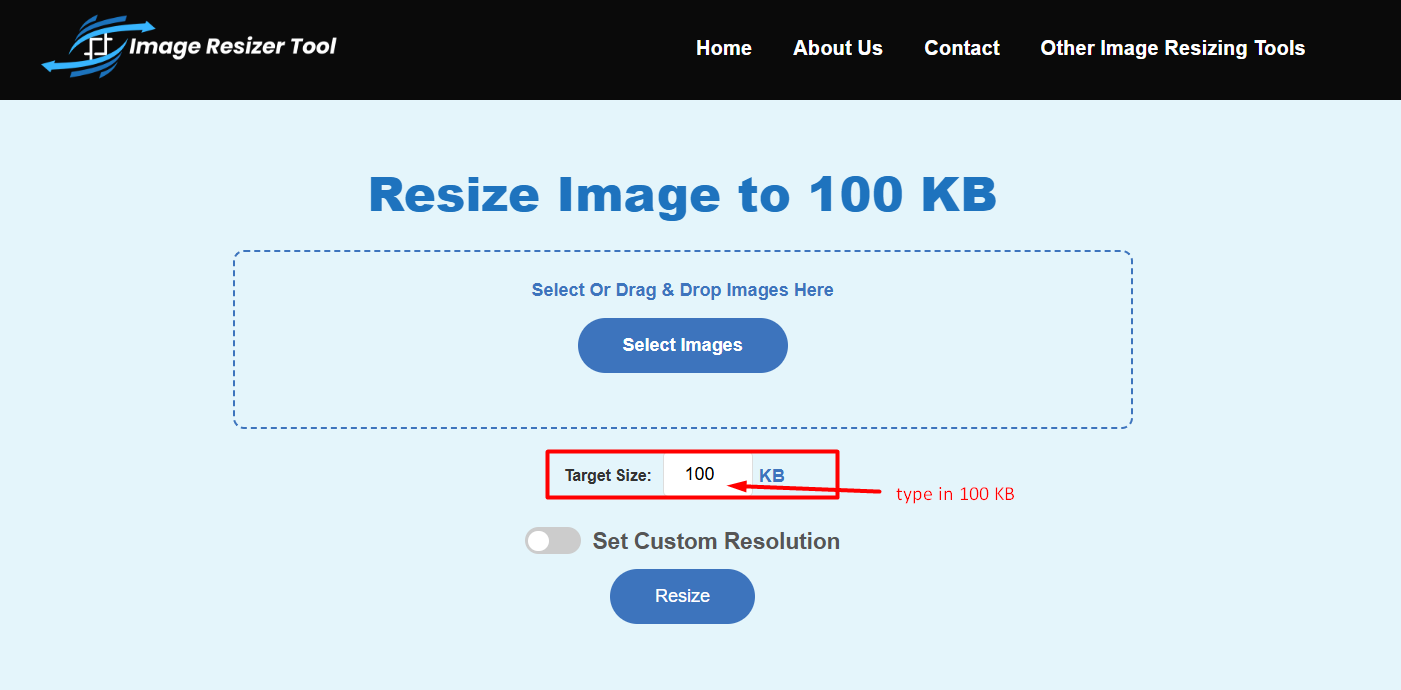 To get this done without downloading heavy software like Photoshop, we are going to use Resize Image to 100 KB. It’s a dedicated tool built specifically for this task.
