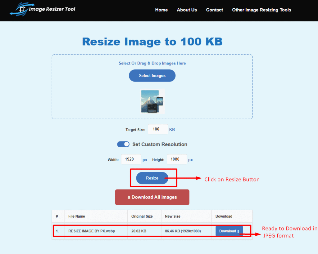 Ready to try it out? Click here to resize your first image to 100KB now.